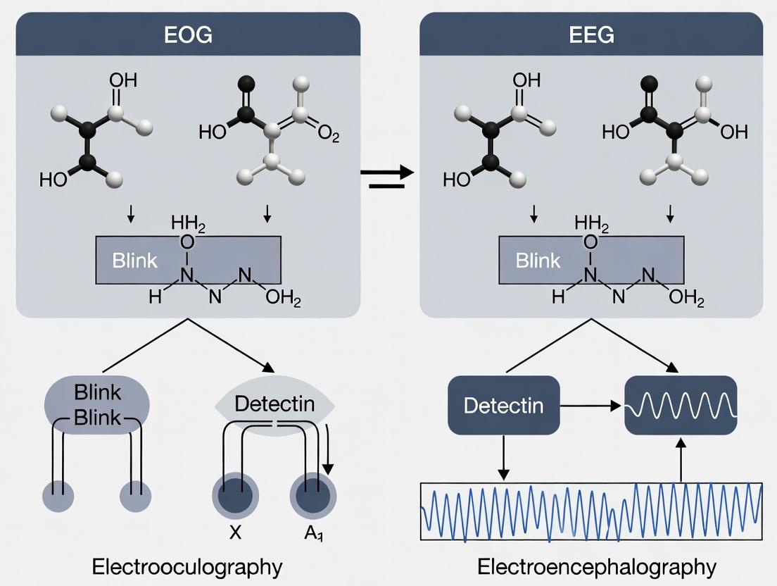 The choice between EOG and EEG for blink-based communication is not a simple binary but a strategic decision based on the target application's priority. EOG offers a robust, high-amplitude signal directly generated by the blink, leading to simpler processing, higher accuracy, and faster communication rates, making it ideal for primary assistive devices. EEG, while more susceptible to noise and requiring more complex algorithms, provides a non-muscular pathway that can be integrated into broader brain-computer interface (BCI) systems, offering a future path for multi-command control. For researchers and drug development professionals, EOG presents a practical, high-fidelity endpoint for clinical trials targeting neuromuscular function, whereas EEG systems may be more relevant for studies of cortical plasticity or integrated neurotechnology. Future directions point toward adaptive, hybrid systems that intelligently leverage both signals, user-specific algorithmic tuning, and miniaturized, wireless hardware. These advancements will drive the development of more reliable, patient-centric communication aids, directly impacting quality of life and offering novel biomarkers for therapeutic intervention in neurodegenerative and neurotraumatic conditions.